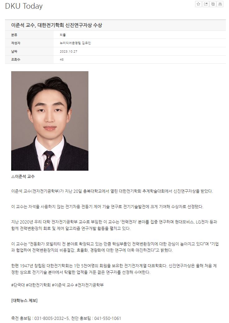 [기사] 이준석 교수, 대한전기학회 신진연구자상 수상