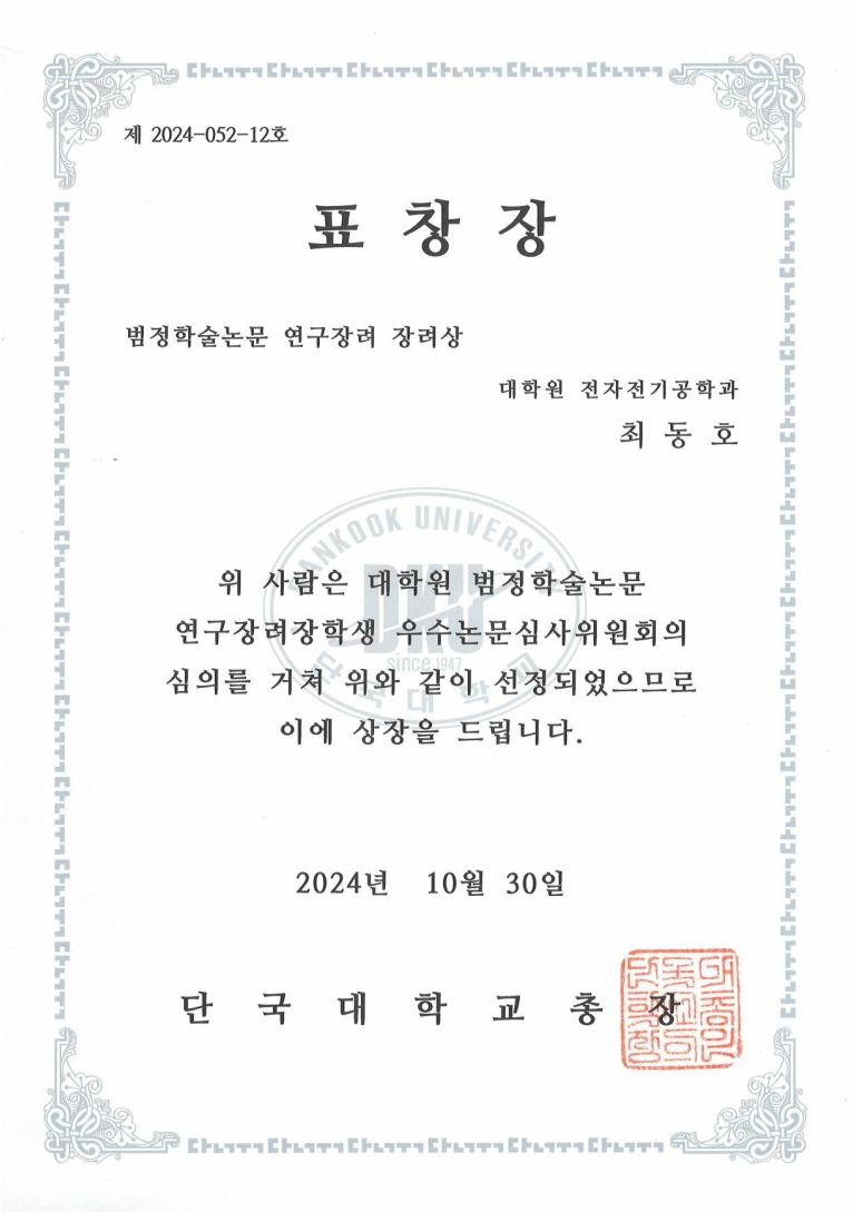 최동호 박사과정, 단국대학교 범정학술논문 연구장려 장려상 수상